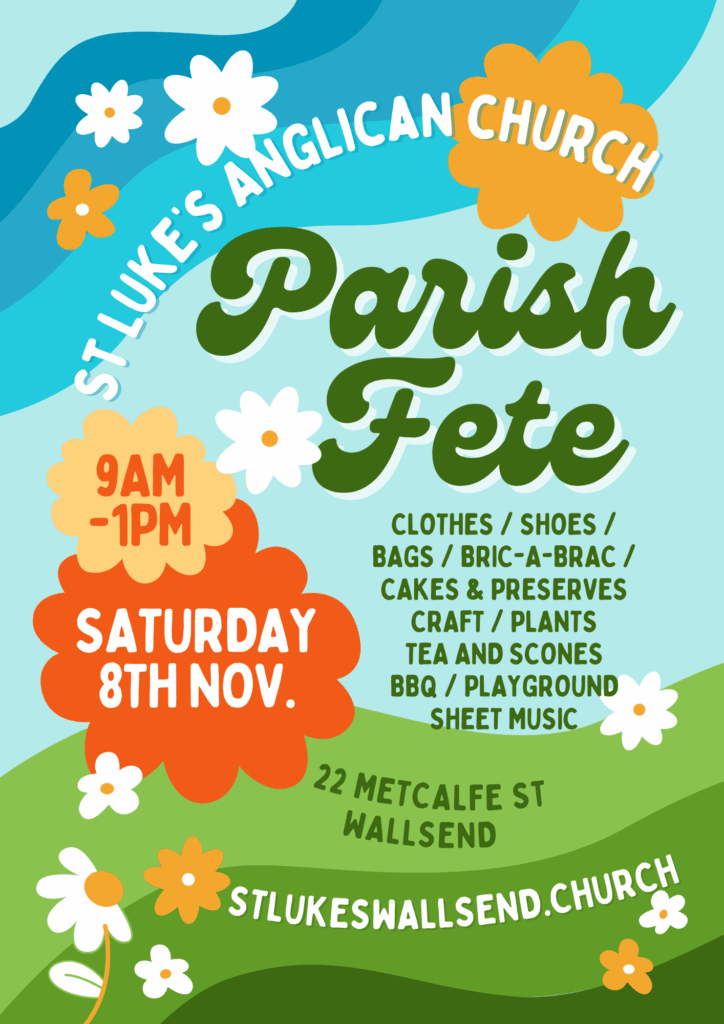 Services SUNDAY Every Sunday at 9am – Sung Mass 3rd Sunday of the month at 5pm- Contemplative Worship Wednesday 11.30am Mass Parish FeteDate: 08/11/2025Time: 9:00 am – 1:00 pmLocation: 22 Metcalfe Street Wallsend